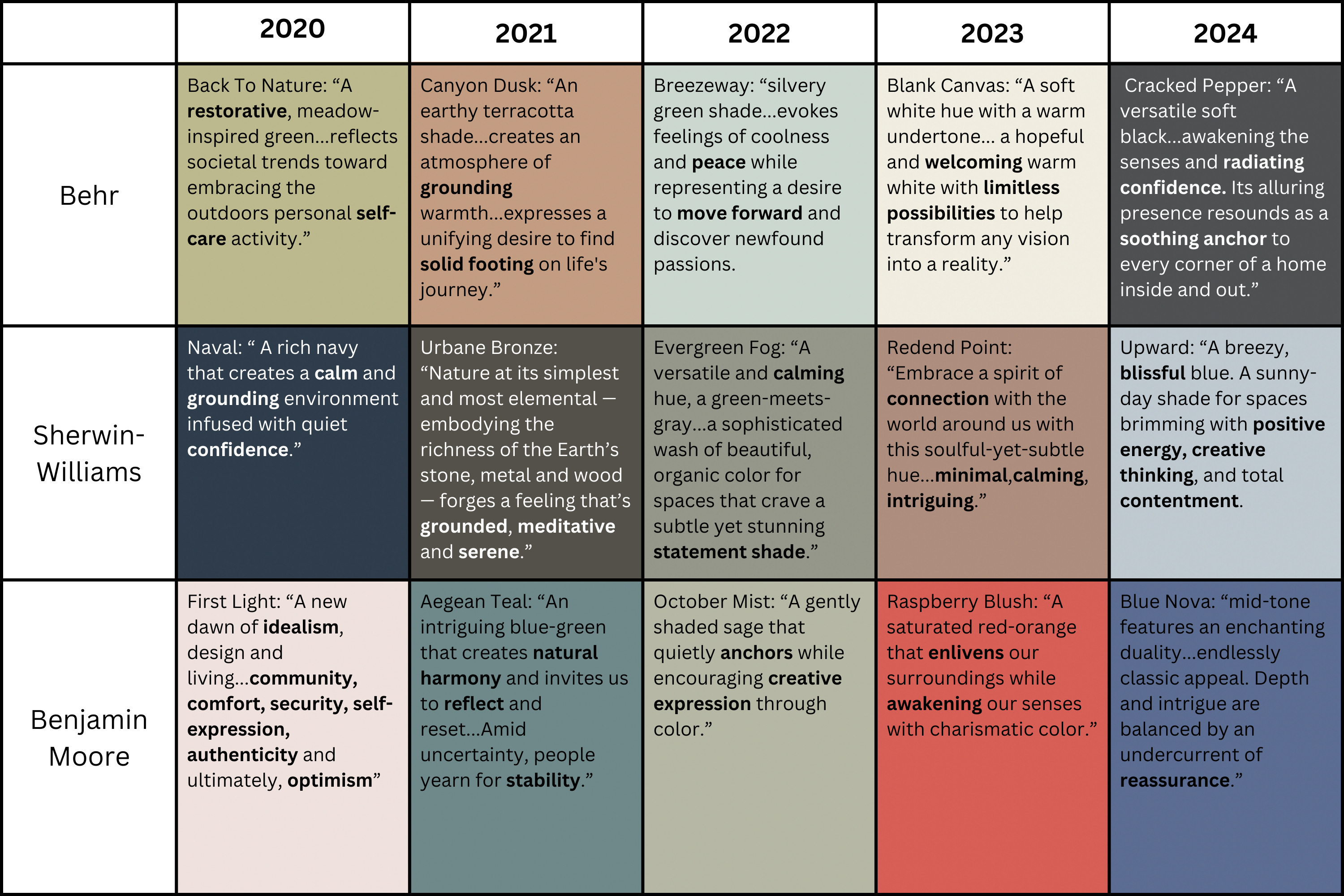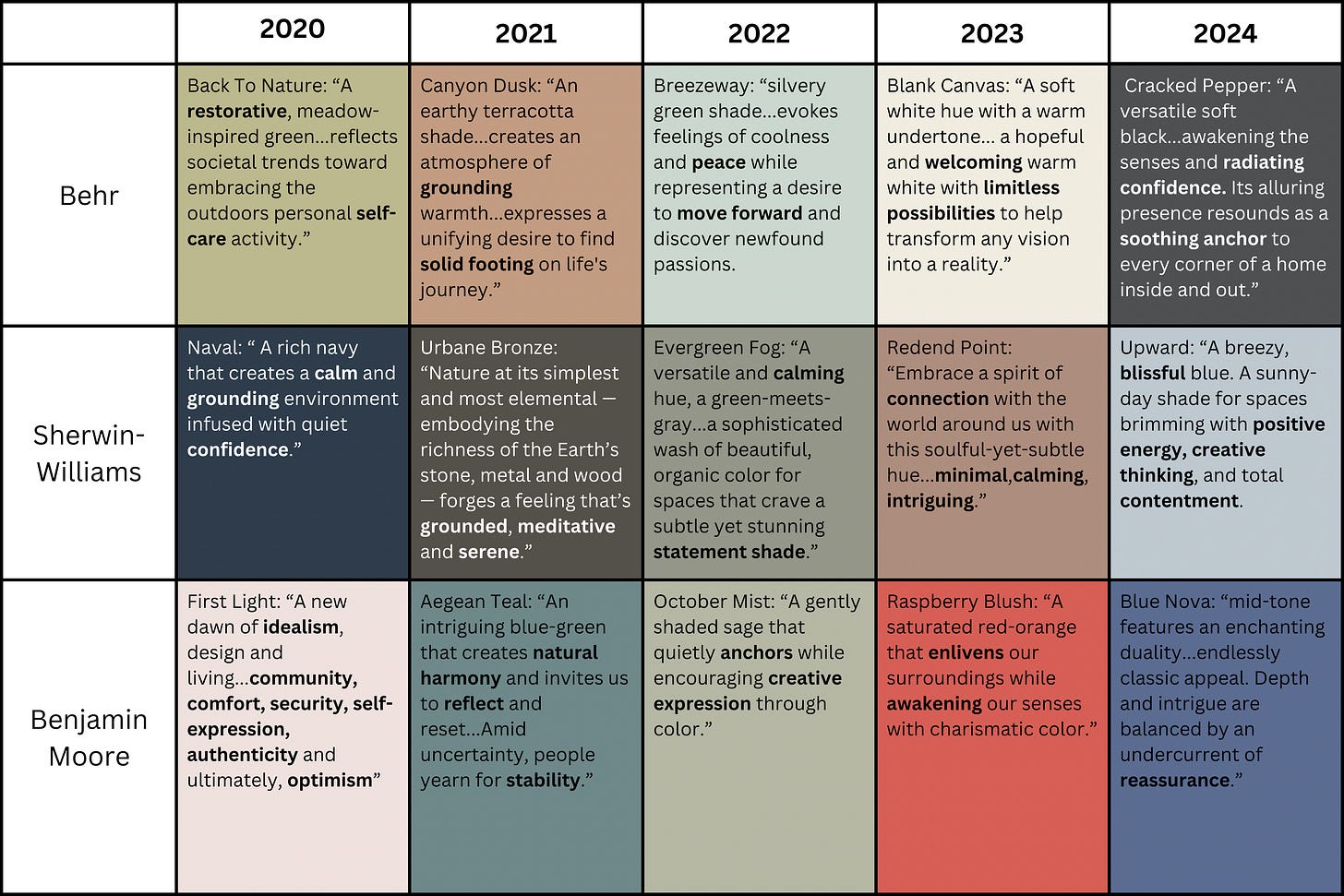 Before I get into what 2025 is trying to tell us, I want to first look at the past handful of years and color predictions from three major paint distributors — Behr, Sherwin, and Benjamin Moore: