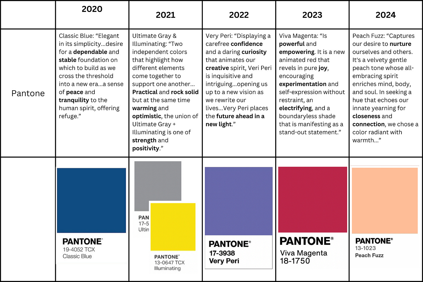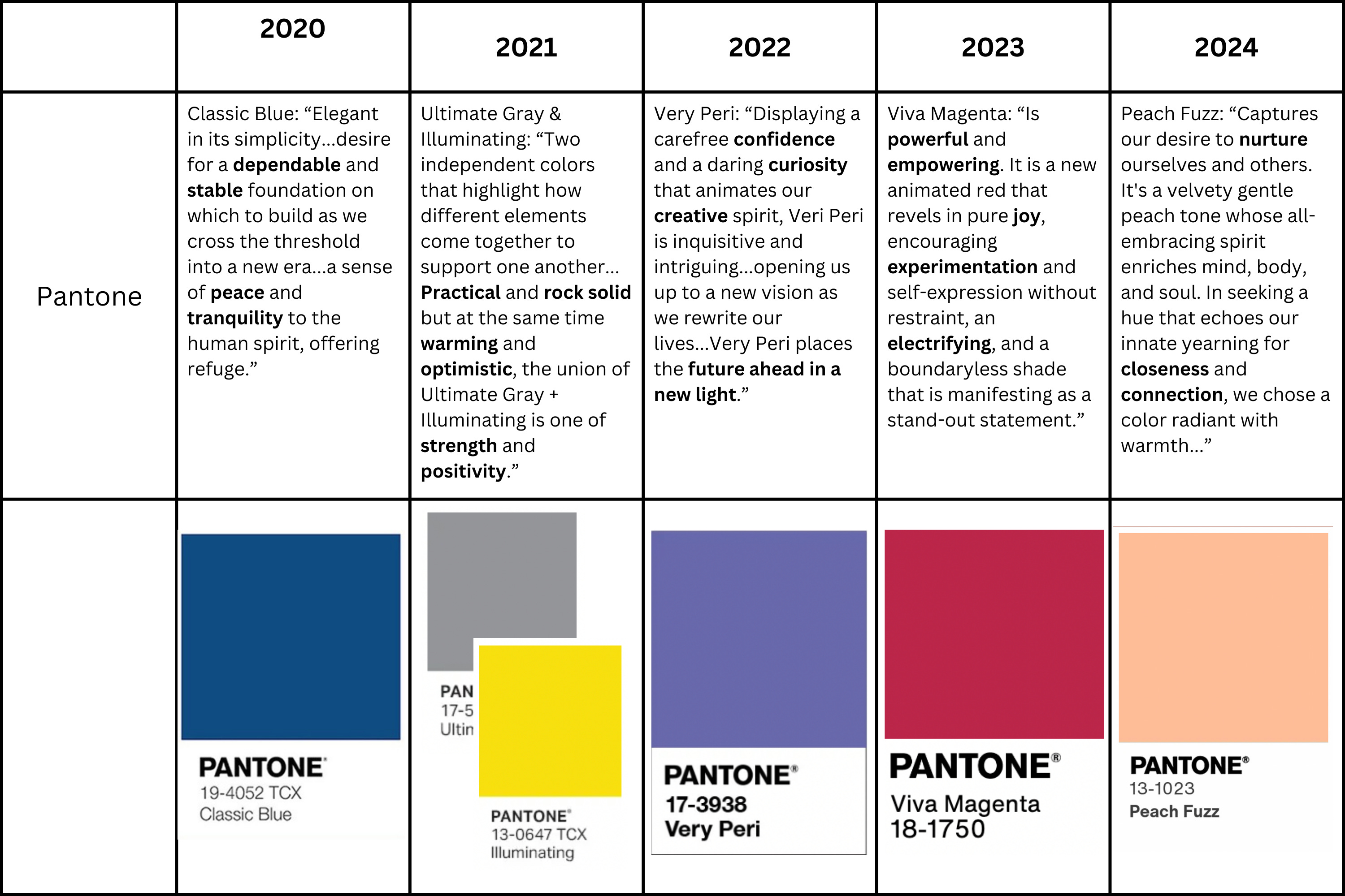 What I do see, looking at paint companies from 2020-2024, is that aside from Benjamin Moore’s “Raspberry Blush,” Colors of the Year do not take risks. This stands in pretty sharp contrast to Pantone, which prefers bold hues. Pantone can be more daring as it’s a guide to everything — there’s less risk in wasting money on a neon yellow dress than painting your dining room that color.