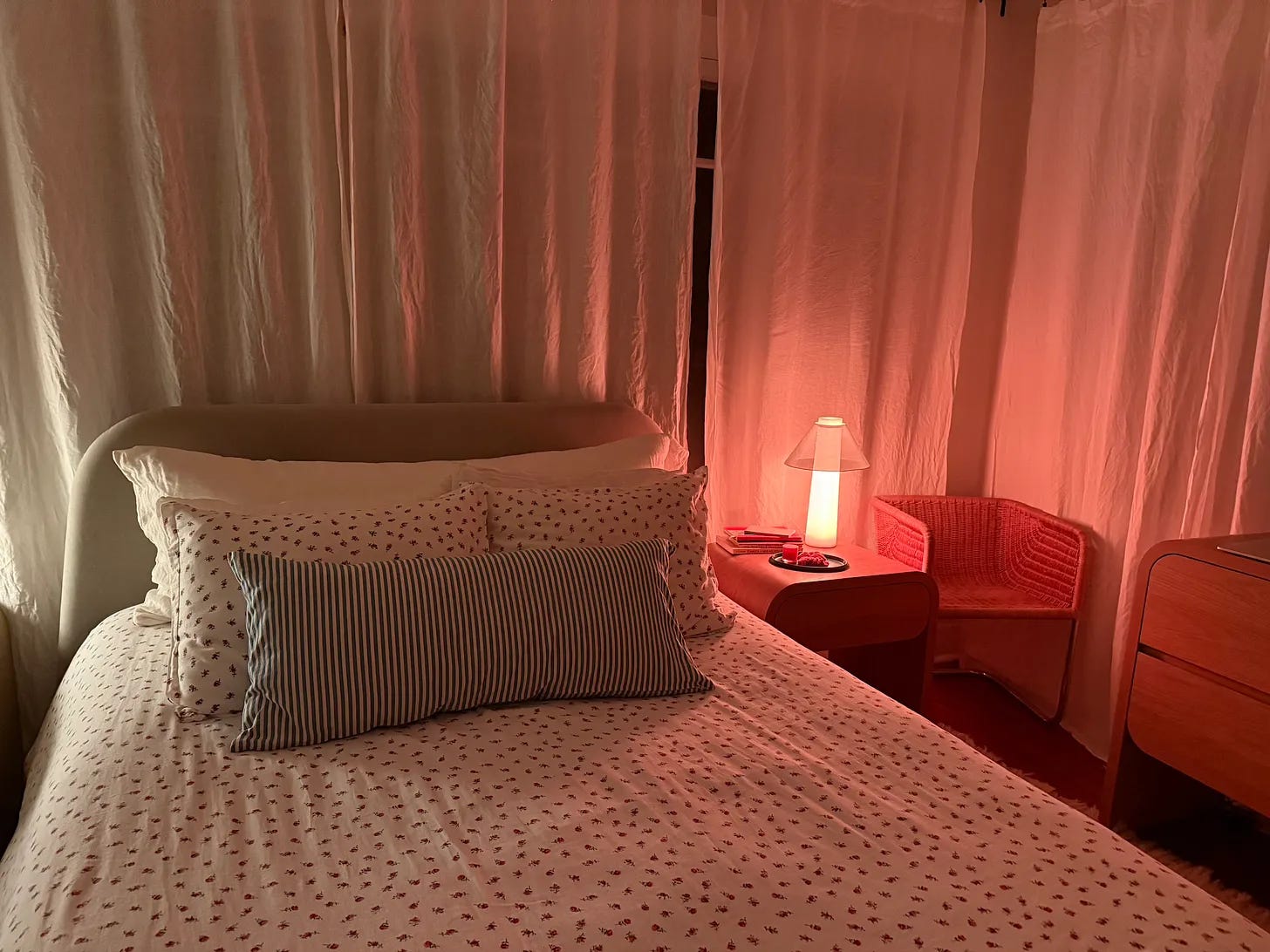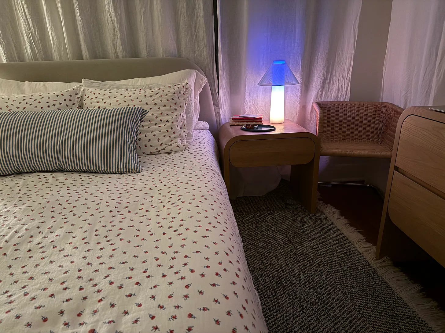 Beyond that, there’s a magical glowy setting that I put on before bedtime (it’s called “Night”). If you’re unfamiliar with the Loftie Lamp, here’s the rundown: You can sync it up with an app where you control the brightness as well as choose from a number of groovy colors and gradients (the base of the lamp lights up). You can set the timer for “Sunrise” and “Sunset” gradual glows. Or opt for “red light mode” which supports your natural rhythm at night and helps you feel sleepy before bed.