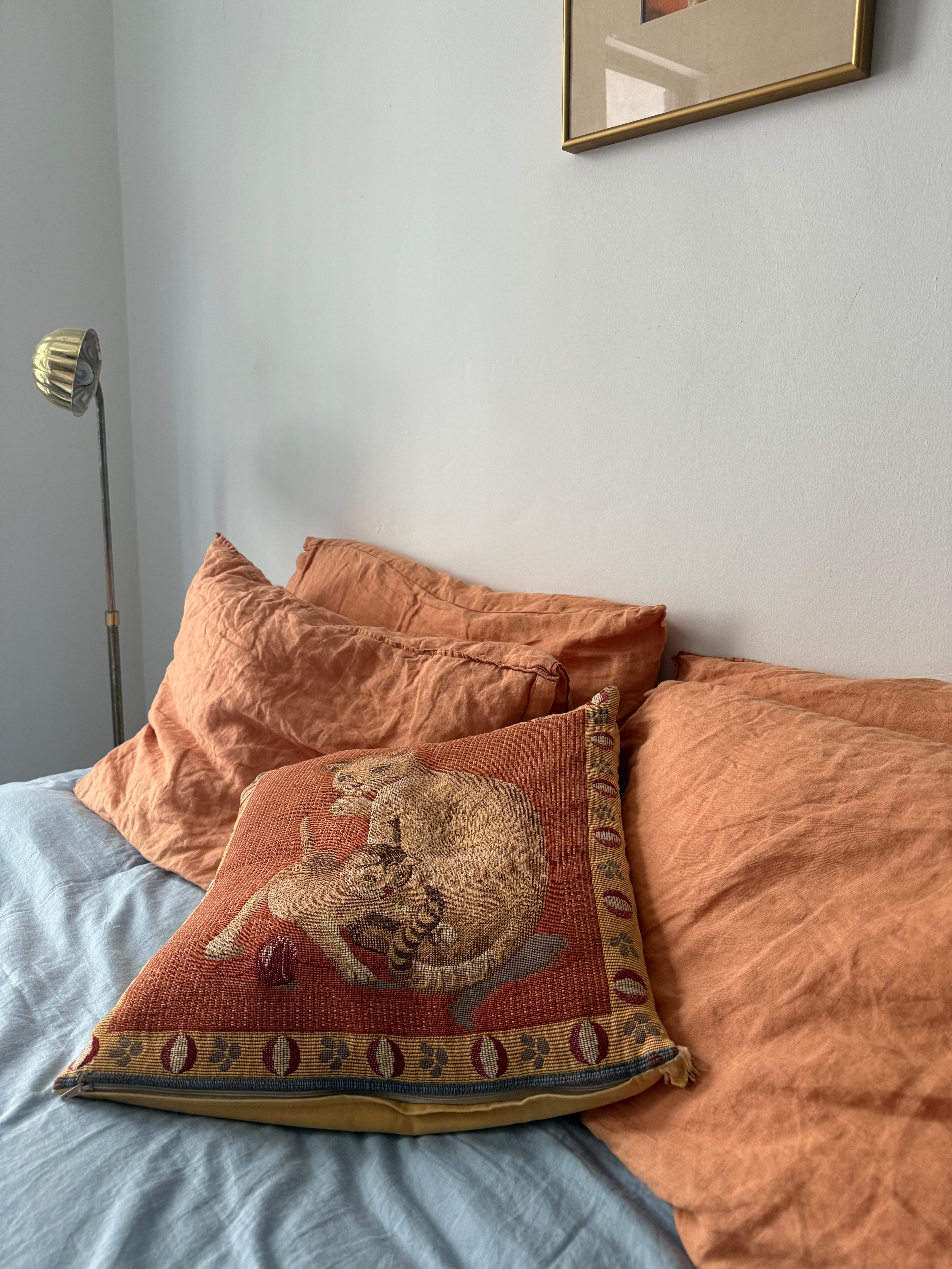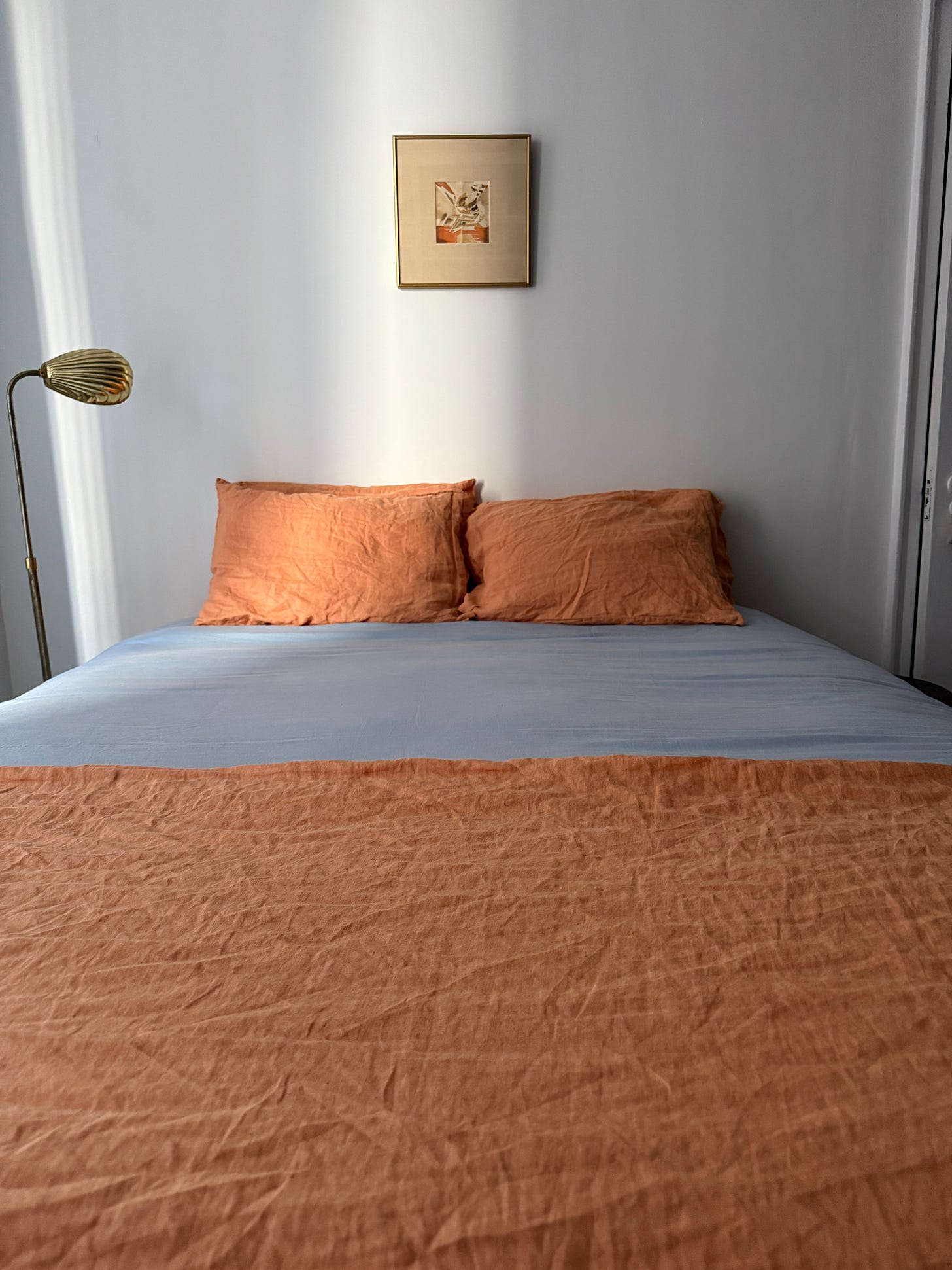The sheets are from my absolutely favorite, Morrow Soft Goods. We have the organic matte sateen duvet cover in a sky blue, and the heirloom linen sheet set in apricot. We are not top sheet people, so the flat sheet acts as more of a blanket and pop of color.