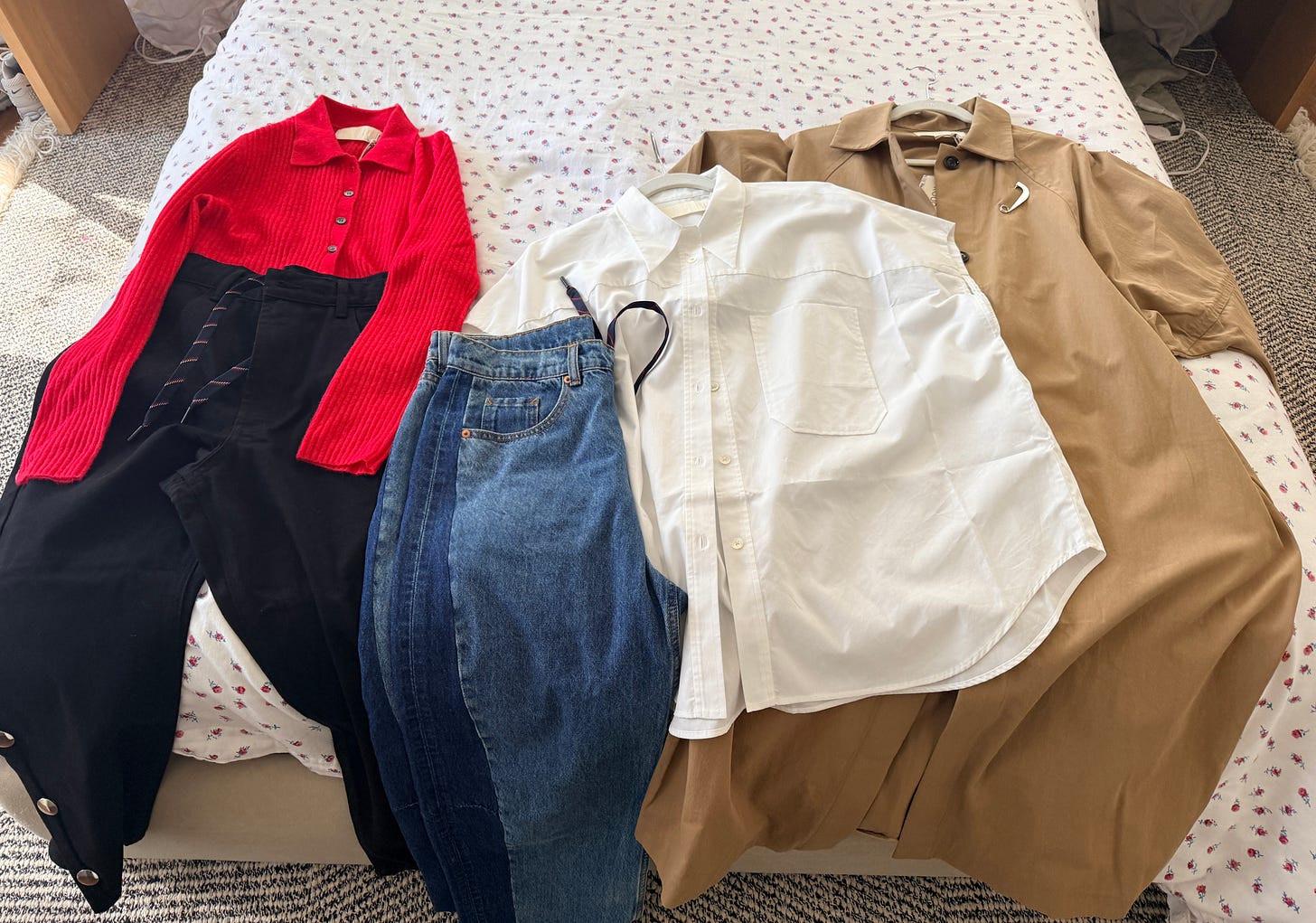 I acquired a bunch of new stuff from my favorite “cool mom” label, Roucha. Many many thanks to my pal, Jill Roucha, for straight up sending me a care package from heaven. I genuinely recommend Roucha for some very specific reasons—many of the jeans feature adjustable drawstrings, and are made of the softest denim I’ve ever felt; the pieces have an architectural edge without feeling too austere; and Roucha also has a points system to get free stuff! Here’s my haul: