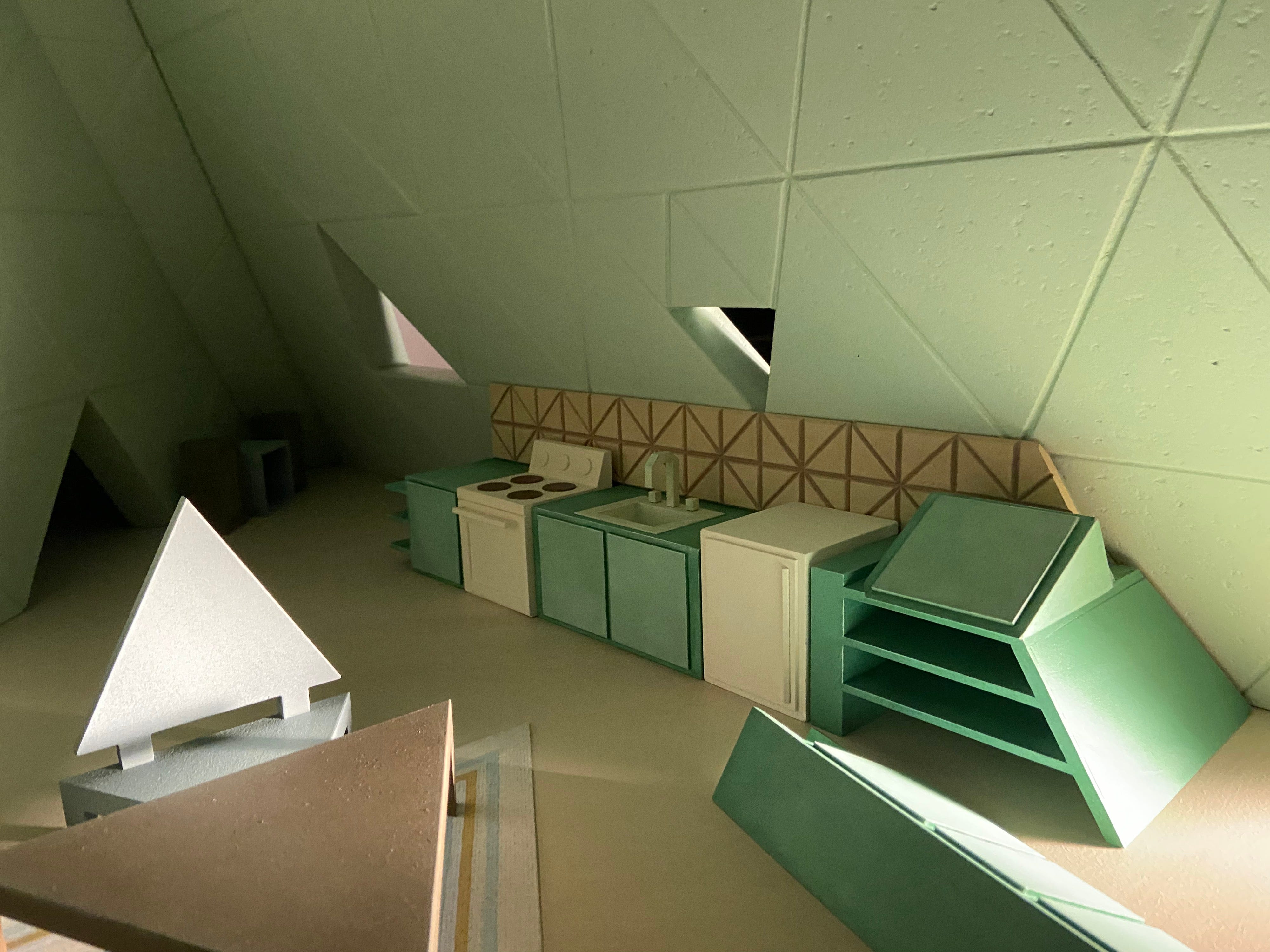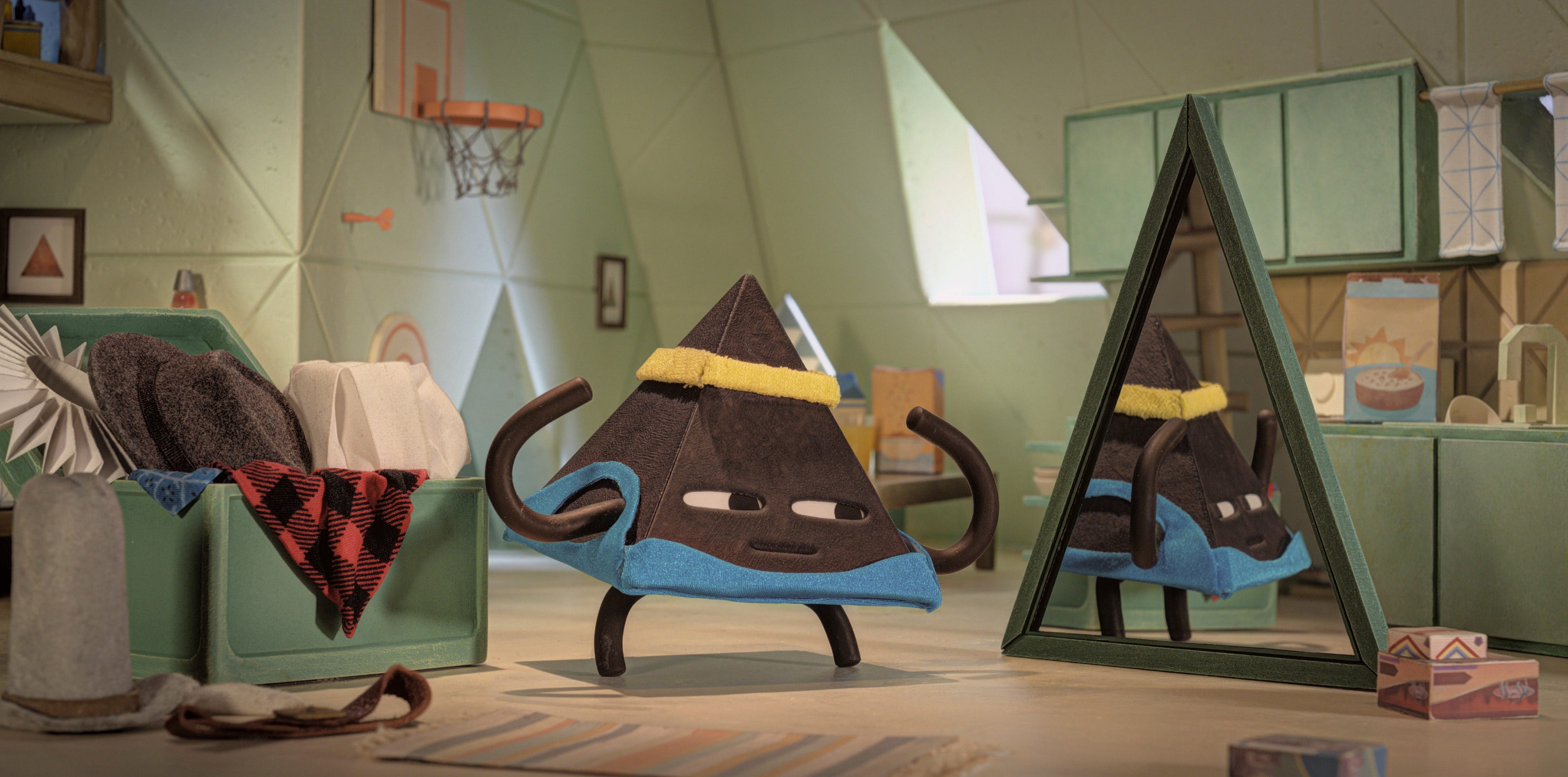 Triangle as a character is a very chaotic kind of guy — so, to be honest, I started from the idea of a messy, stoner-kid college dorm room. Once we decided he was going to live in a pyramid, we realized: there's nothing chaotic about pyramids. They're very structured. In the end, we took inspiration from the Louvre, creating a pyramid out of pyramids (or triangles). But on the interior, we could make everything intentionally cluttered and disordered, in contrast to the strict geometry of the form. It was about keeping his personality alive within such a rigid structure.