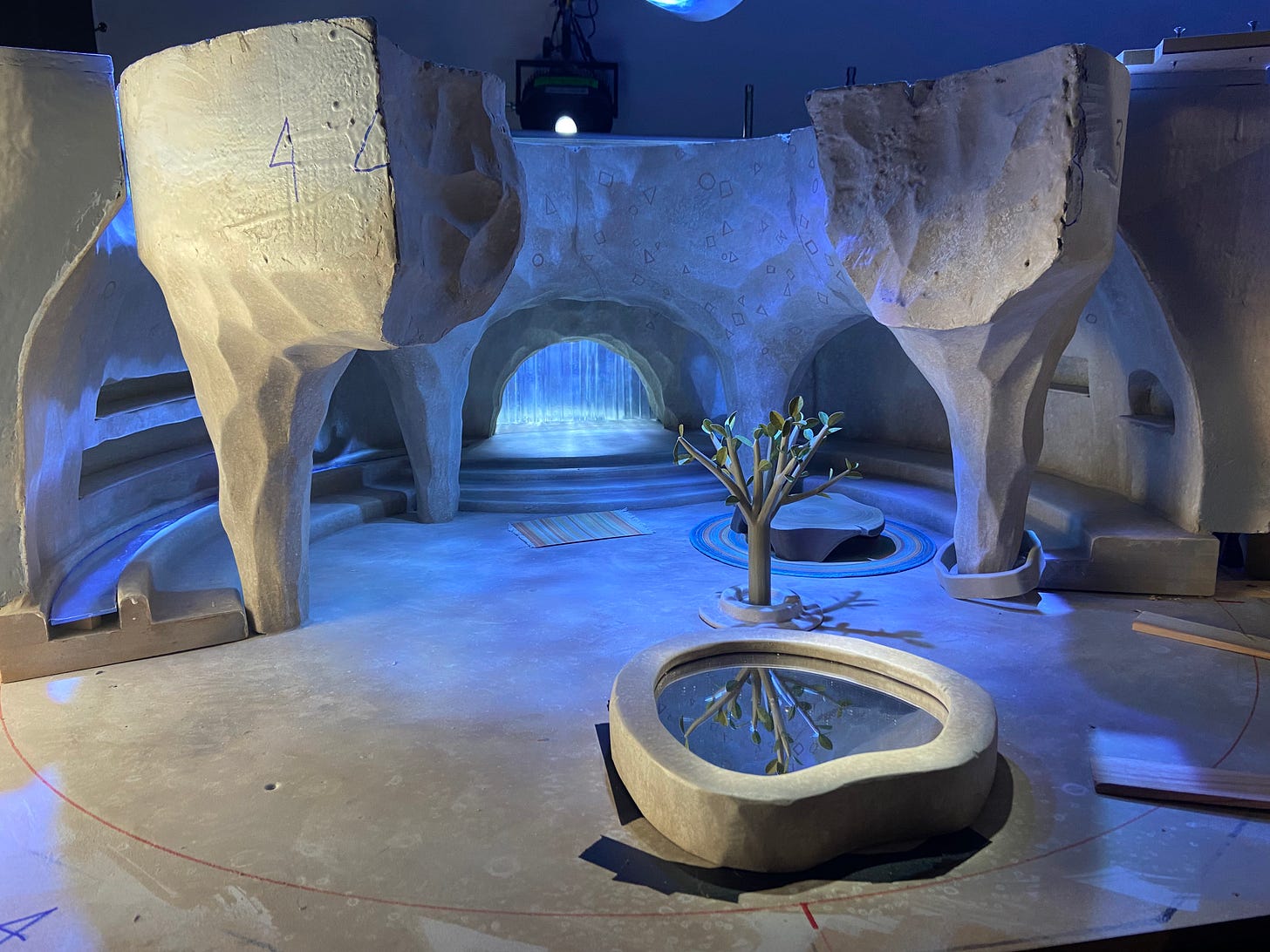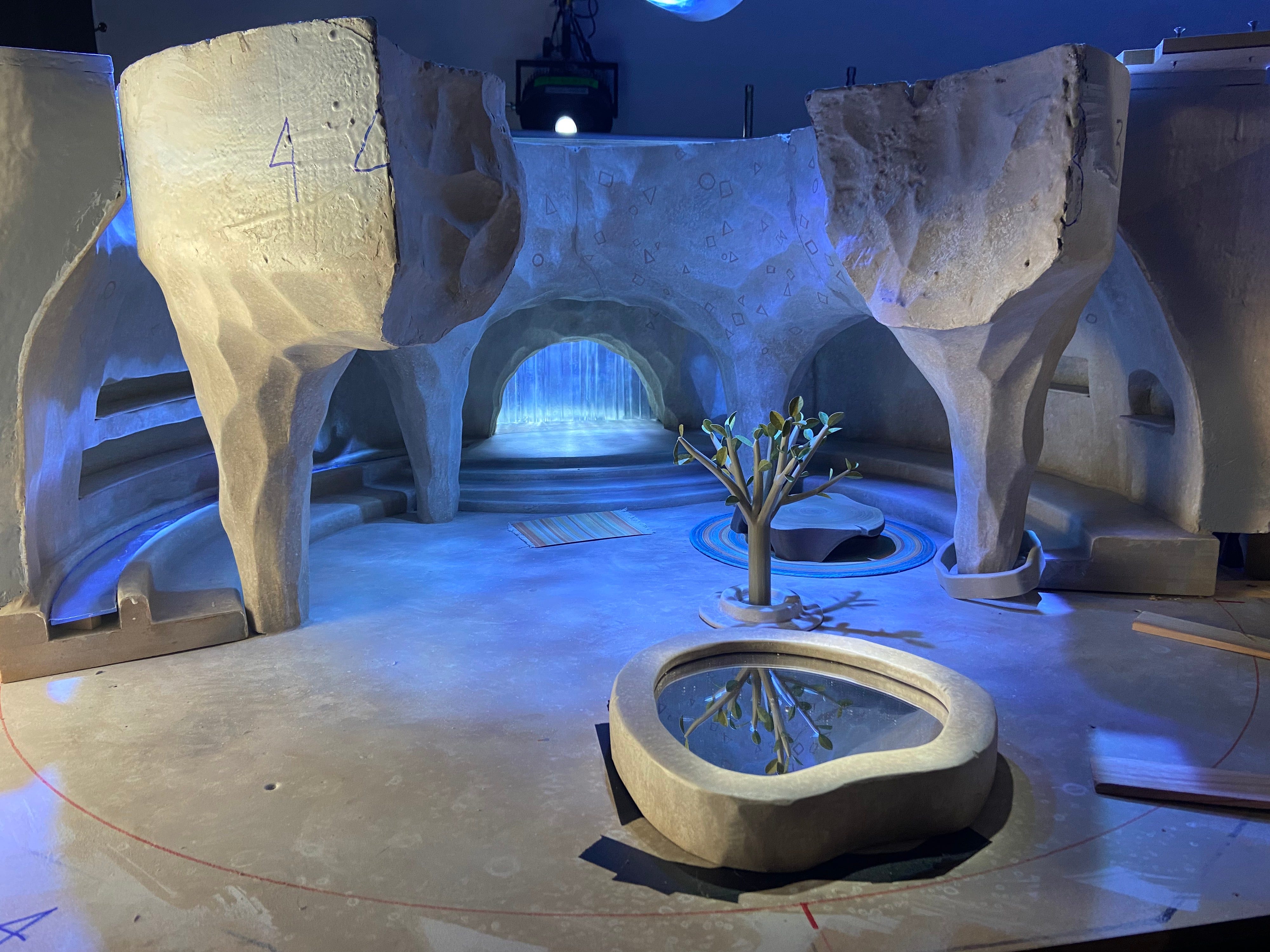 Circle’s home needed to feel cave-like but not scary — inviting instead of foreboding. I designed a central chimney to let light in, paired with a moat of constantly moving water running around the perimeter, sort of like one of those sushi-go-rounds. That refracted light beautifully across the space, creating a caustic effect. Our DP, Eric Adkins, figured out how to simulate moving water in stop motion, which is always tricky since you can’t use real water.