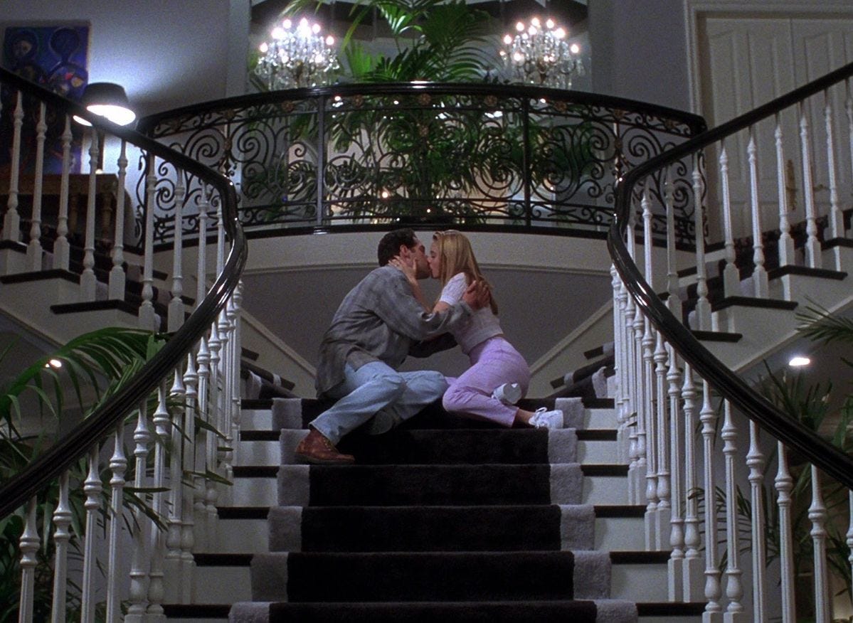 Disjointed in style indeed. Cher’s house combines an astonishing array of references that blend into a kind of generalized “European” imitation — one that some Americans at the time deemed to be “elegant.” The exterior is neoclassical, the windows kinda French, and the grand staircase has scrollwork worthy of an Olive Garden.