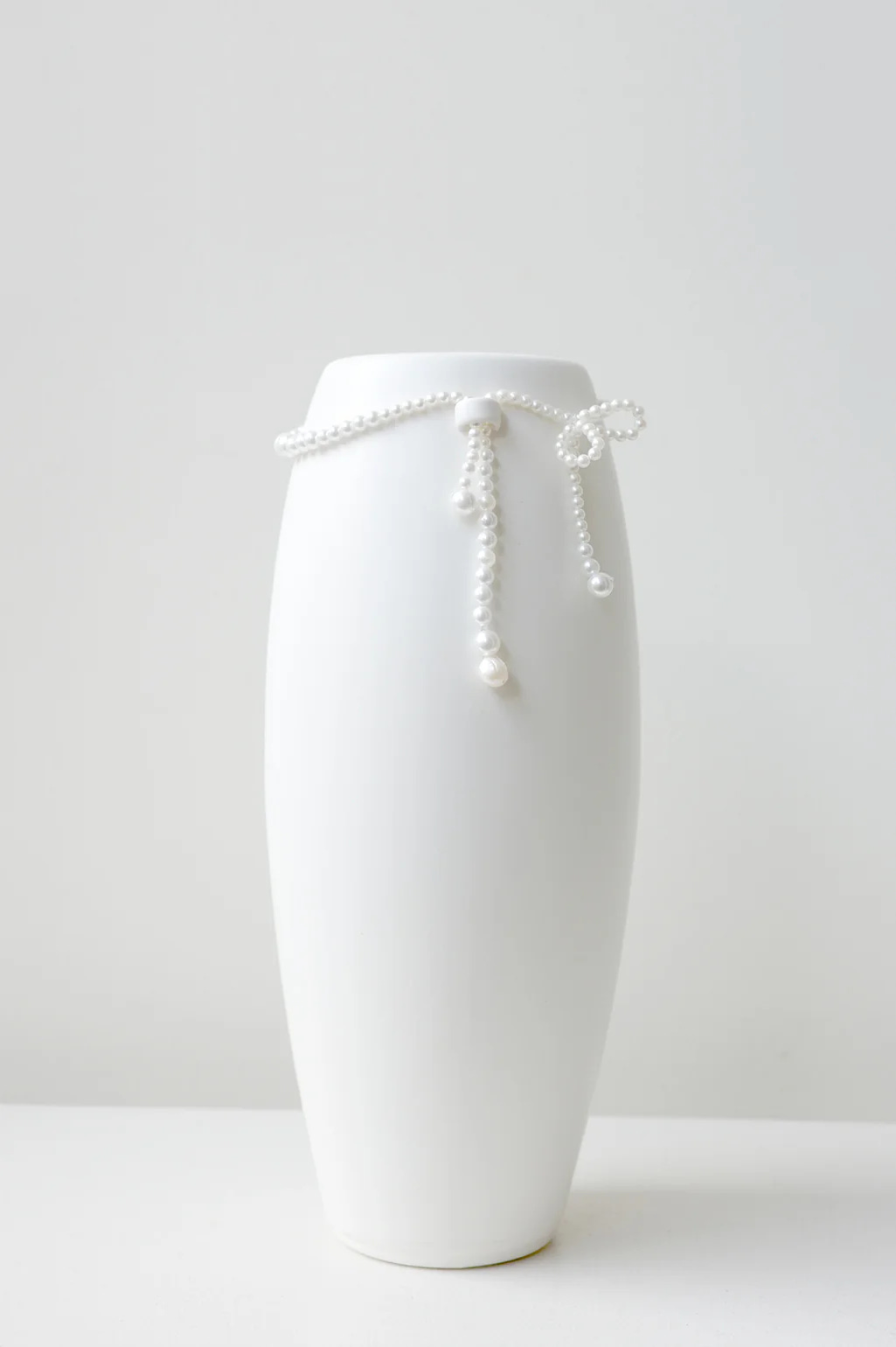 Completedworks (same people who did the green pearl napkin rings) have a number of vases adorned with either strands or bows of pearls. Some vessels feature faux pearls, but this one offers freshwater pearls.