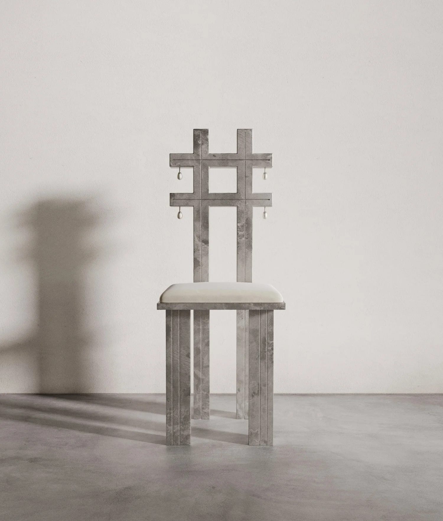From the French designer’s “Rituals of Adornment” collection, this aluminum chair features a quartet of dangling natural pearls. This would be the sickest vanity chair, don’t you think?