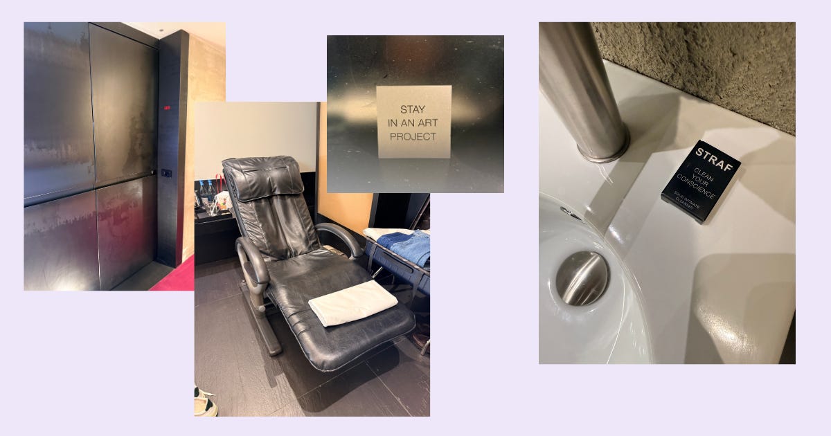 Then it was back to the hotel for a brief rest. The STRAF is lovely and in a really great central location, but it’s also puzzlingly hilarious. The tagline is “stay in an art project,” and the site reads, “We love musicians, DJs, artists, installations, performance art, conceptual art and cosy bedrooms that defy convention.” I can best describe the decor as hard and slightly aggro. The door to your room will look like a bunker. And you will also likely have a massage chair in your room. Not an arty-looking massage chair, but a very standard nail salon type massage chair, which truly seems like a line item that could have been cut from the design budget. I rightly guessed that this hotel was designed by a man. But! It’s quiet, the rooms are spacious, and the staff is very nice.
