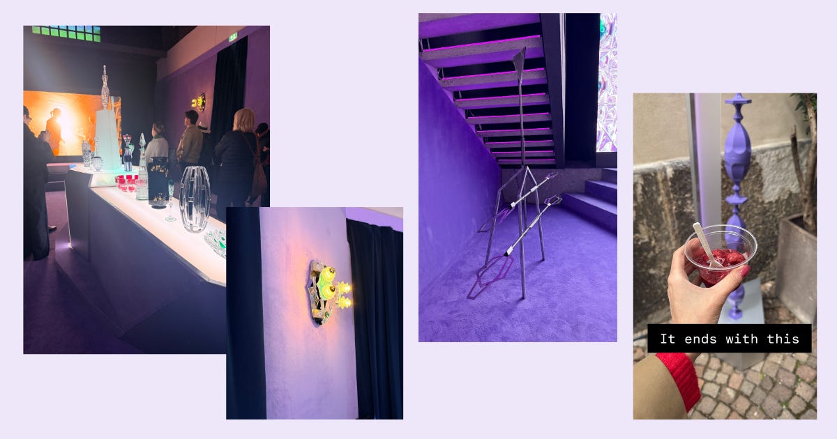 I then had a reservation for Baccarat’s exhibition, titled Crystal Crypt, an installation created by artist Emmanuelle Luciani. Despite the reservation, I spent about 45 minutes in line. Visitors stepped into a room covered floor-to-wall in purple carpet, and were then subjected to a 12-minute movie I can best describe as Vulcan Orgy of Nightmarish Proportions in a Glass Factory.